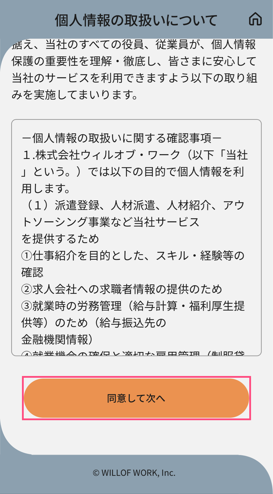 個人情報の取扱いについて、お読みいただき、同意いただけるようでしたら、「同意して次へ」選択し、次へ進んで下さい