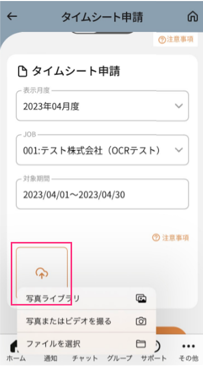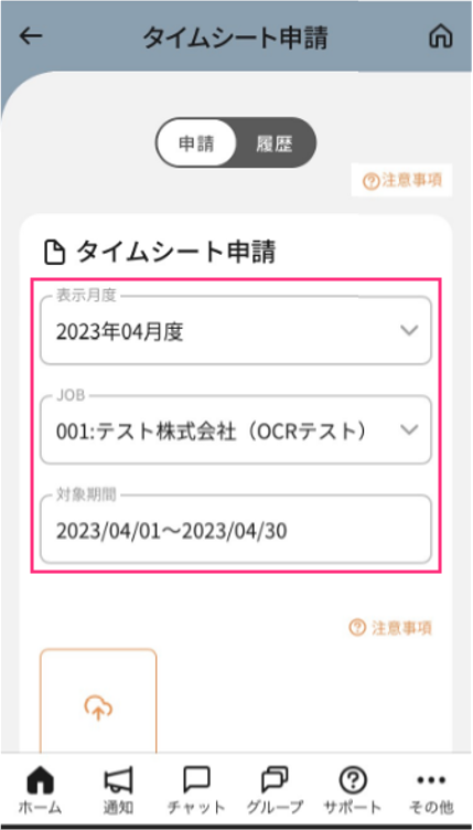 TOP画面の「その他勤怠」もしくはメニューバー>申請する>タイムシート申請をクリックする。
